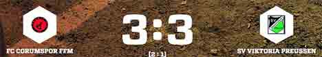 Die Gastgeber ergatterten einen wertvollen Punkt im Kampf gegen den Abstieg und trotzten den ambitionierten Preußen ein 3:3-Remis ab. Mit nun neun Punkten rangiert der FC Corumspor weiter auf Platz 15, während die Gäste sich zum ersten Mal in dieser Spielzeit die Punkte teilen mussten. Rang sechs mit 19 Punkten lautet die Zwischenbilanz für den ehemaligen Gruppenligisten von der Hügelstraße.