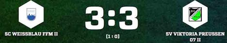 Bis zum Stand von 3:1 nach Toren von Curbach (28.) und Ulmer (65./70.) bei einem Gegentreffer von Abbouz (55.) traten die Gastgeber dominant auf, dann geriet Weiss-Blau durch Verletzungen in Bedrängnis. Zwei Treffer von Sporer brachten den „Preußen“ noch einen Punkt (73./85.). „Insgesamt hatten wir noch große Chancen“, sagte Leo Falcetta, der Trainer von Weiss-Blau.