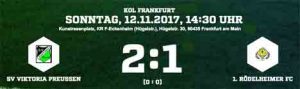 “Nach dem 2:0 war die Luft raus und wir haben auf Zeit gespielt. So wurde es nach dem Anschlusstreffer noch einmal hektisch, aber Rödelheim hat nichts Konstruktives mehr zustande gebracht“, berichtete Thomas Mahlau, der Fußball-Abteilungsleiter der Preußen. Im Tor stand der 18-jährige A-Jugendliche Cedric Wohlgemuth, den Trainer Ramzi Kallel nach der Verletzung von Stammtorhüter Mert Aydin in das kalte Wasser geworfen hatte. Nach torloser erster Hälfte führte ein Eckball von Giuliano Amante zur Führung der Platzherren. Stefano Amore hielt die Wade hin und es hieß 1:0. Beim 2:0 profitierte Amante von der Halbherzigkeit des RFC-Torhüters Lucas Fleege, den er mit einem Schuss ins lange Eck überwand. Die abstiegsgefährdeten Rödelheimer verkürzten durch Sayed Maqsoud Hashimi, als die Gastgeber nicht richtig klären konnten und Jakob Dickmann den Ball gegen den eigenen Pfosten setzte. RFC-Pressesprecher Volker Flauaus meinte: “Wir wollten mit nur einer Spitze spielen und auf Nummer sicher gehen. Das ging in die Hose. Wir haben Beton angemischt und wollten die Null halten. Nach vorne war das aber zu wenig und irgendwann kriegst Du halt so ein dummes Tor“.