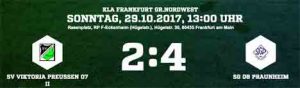 Kadir Özen verkürzte per Foulelfmeter (39.), Tom Angenendt glich aus (51.). Die Gastgeber warfen weiter alles nach vorne. Praunheim hielt dagegen und kam durch Robin Piechota (84.) und Aleksic (90.+4) zu drei Punkten. “Wir haben zu viel gewollt, das ging nach hinten los“, ärgerte sich Preußens Sportlicher Leiter Thomas Mahlau. Praunheims Vorsitzender Michael Petzold sagte: “Wir haben Moral bewiesen.“