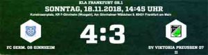 freute sich Ginnheims Spielausschuss-Chef Ralf Müller. Die Tore: 1:0 Mümin Tasiran (25., Eigentor), 1:1 Gaetano Stagno (35.), 2:1 Giulio Federico (46.), 3:1 Kim Schwerdfeger (58.), 3:2 Oskar Copik (80.), 4:2 Lennart Fox (83.), 4:3 Tom Angenendt (90.+2). Bei den Gästen sah Marko Bracic wegen einer Tätlichkeit die Rote Karte (70.).