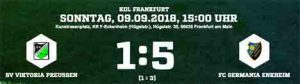 Zwar brachte Oskar Copik die Eckenheimer in Führung (13.), doch die weiteren Offensivbemühungen scheiterten an der gut disponierten Germania-Abwehr. Auf der Gegenseite machten die Gäste praktisch aus jeder Chance ein Tor. Kareem Baumann gelang der Ausgleich (18.), dann trafen Dominik Jung (23.) und Maximilian Krebs (41.).