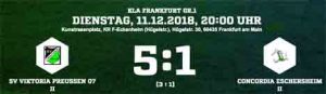 Concordia II begann bei Wiederanpfiff mit Raul Schierle für Simon Back, alle Hoffnungen auf einen Zähler erhielten später jedoch den vorentscheidenden Dämpfer. Wieder nach einem Eckball stocherte Israel Ortigas Gay die Kugel aus dem Gewühl heraus zum 4:1 ins Netz (64.). Und weil die Eschersheimer weiterhin nachlässig verteidigten, fiel auch noch das fünfte Gegentor. Ein völlig kopfloser Einwurf in den eigenen Strafraum ermöglichte Copik den 5:1-Endstand (85.). Am Ende stand ein souverän herausgespielter Kantersieg der Reserve von Viktoria Preußen, die damit die Punkte 19 bis 21 auf ihr Konto schaufelte. Eschersheim II war an diesem Abend chancenlos, steht aber auch dank der starken ersten Saisonphase als bester Aufsteiger mit 31 Zählern auf dem soliden achten Tabellenplatz.