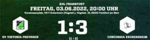 In der auf Freitagabend vorgezogenen Begegnung des vorletzten Spieltags der Kreisoberliga Frankfurt unterlag der SV Viktoria Preußen dem Nachbarn Concordia Eschersheim mit 1:3 (1:2). Im Vorspiel standen sich die Classics von Viktoria Preußen und Heddernheim in einem Einlagespiel gegenüber.